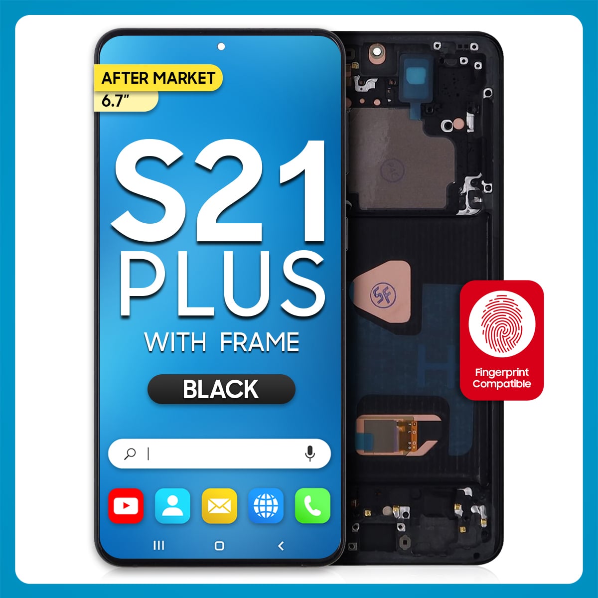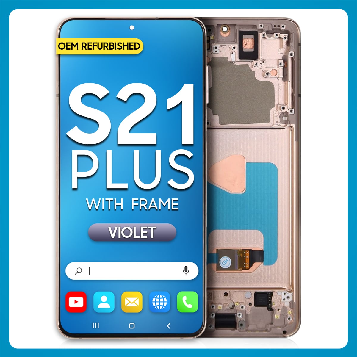 The Samsung S21 Plus 5G LCD with Touch + Frame Phantom Silver (Refurbished) is a trademark owned by Samsung Inc., registered in the United States and other jurisdictions.