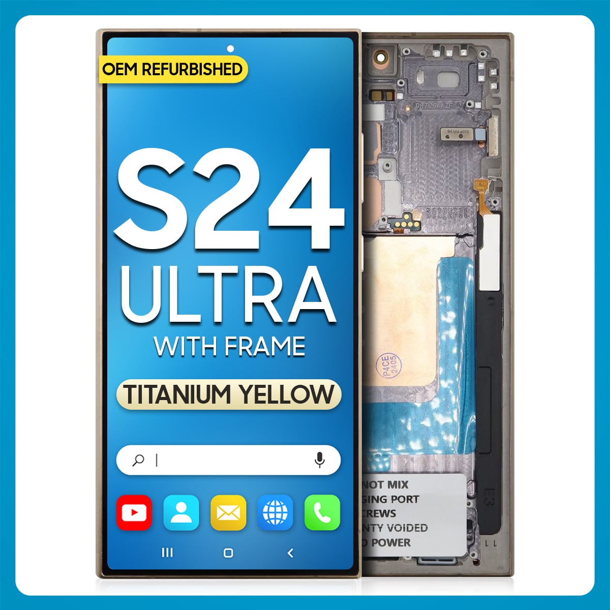 The Samsung S24 Ultra LCD with Touch + Frame Titanium Yellow (Refurbished) is a trademark owned by Samsung Inc., registered in the United States and other jurisdictions.